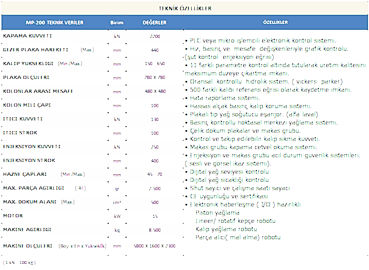 MP-200 TON METAL ENJEKSİYON PRESİMetal Enjeksiyon Makine ÇeşitlerimizMP-160 TON METAL ENJEKSİYON PRESİMP-200 TON METAL ENJEKSİYON PRESİMP-300 TON METAL ENJEKSİYON PRESİMP-400 TON METAL ENJEKSİYON PRESİMP-550 TON METAL ENJEKSİYON PRESİMP-750 TON METAL ENJEKSİYON PRESİMP-900 TON METAL ENJEKSİYON PRESİMP-1100 TON METAL ENJEKSİYON PRESİMP-1350 TON METAL ENJEKSİYON PRESİMP-1650 TON METAL ENJEKSİYON PRESİMP-2000 TON METAL ENJEKSİYON PRESİ GÖRÜNTÜ VE BOYUTLARI (STANSART) GÖRÜNTÜ VE BOYUTLARI (YENİ SİSTEM) KALIP BAĞLANTI ŞEMASI