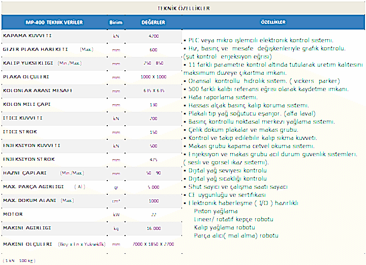 MP-400 TON METAL ENJEKSİYON PRESİMetal Enjeksiyon Makine ÇeşitlerimizMP-160 TON METAL ENJEKSİYON PRESİMP-200 TON METAL ENJEKSİYON PRESİMP-300 TON METAL ENJEKSİYON PRESİMP-400 TON METAL ENJEKSİYON PRESİMP-550 TON METAL ENJEKSİYON PRESİMP-750 TON METAL ENJEKSİYON PRESİMP-900 TON METAL ENJEKSİYON PRESİMP-1100 TON METAL ENJEKSİYON PRESİMP-1350 TON METAL ENJEKSİYON PRESİMP-1650 TON METAL ENJEKSİYON PRESİMP-2000 TON METAL ENJEKSİYON PRESİ GÖRÜNTÜ VE BOYUTLARI GÖRÜNTÜ VE BOYUTLARI (YENİ SİSTEM) KALIP BAĞLANTI ŞEMASI View the embedded image gallery online at:https://guidedcontentquest.quest/metal-pres-makina-urunler/metal-enjeksiyon-makinalari/mp-400-ton-metal-enjeksiyon-presi.html#sigProGalleria0448404c98